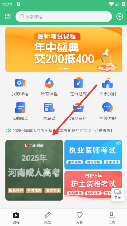 1、在【课程】页面,可查看各类考试课程,如【医师笔试课程】【2025年河南成人高考】等。