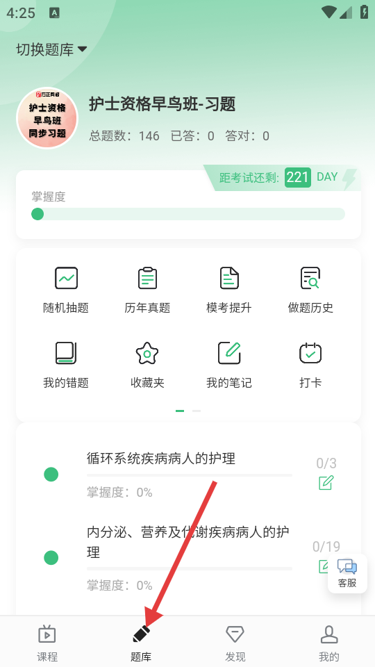 2、点击底部【题库】,进入题库页面,能进行随机抽题、做历年真题等习题练习操作。