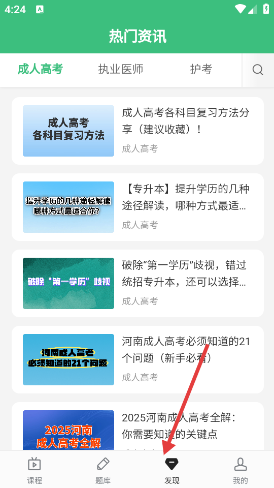3、切换到【发现】页面,可浏览成人高考、执业医师、护考等类别的热门资讯信息。