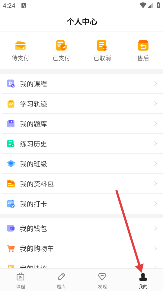 4、进入【我的】个人中心,可查看待支付、已支付订单,以及我的课程、学习轨迹等个人内容。