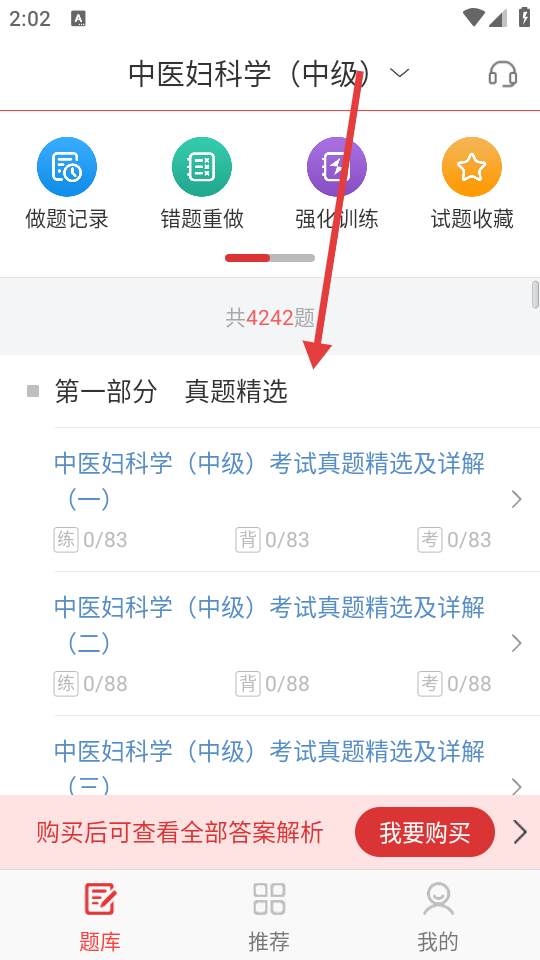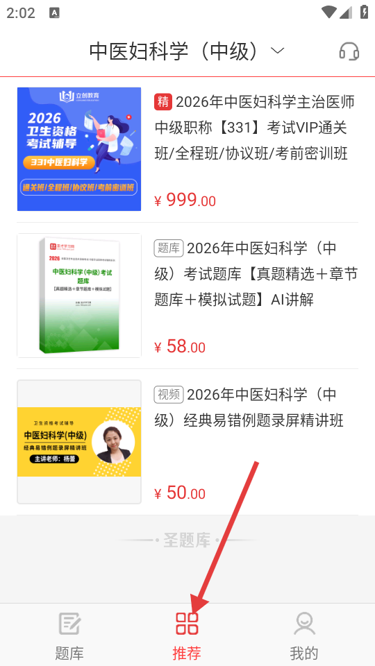 3、进入【推荐】页面,可查看考试题库、精讲班等推荐内容,按需购买。