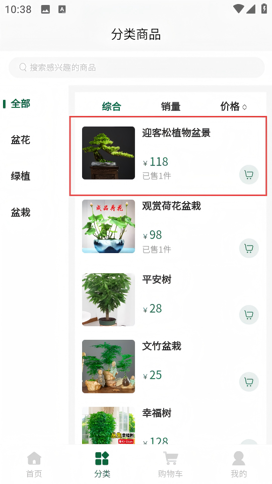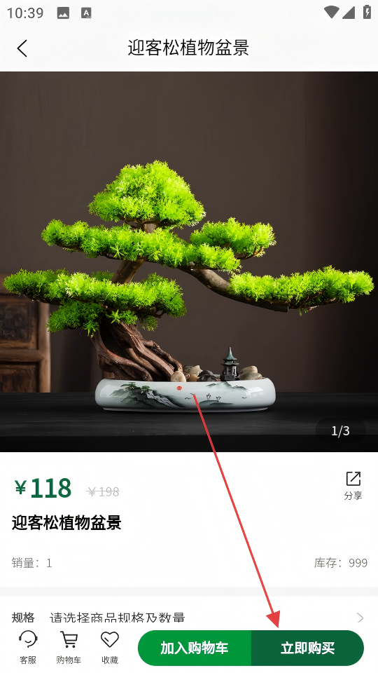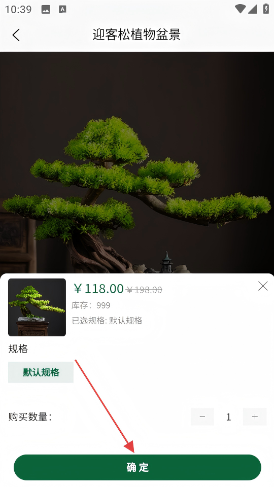 2、在分类商品页面选择【迎客松植物盆景】,进入该商品详情页。