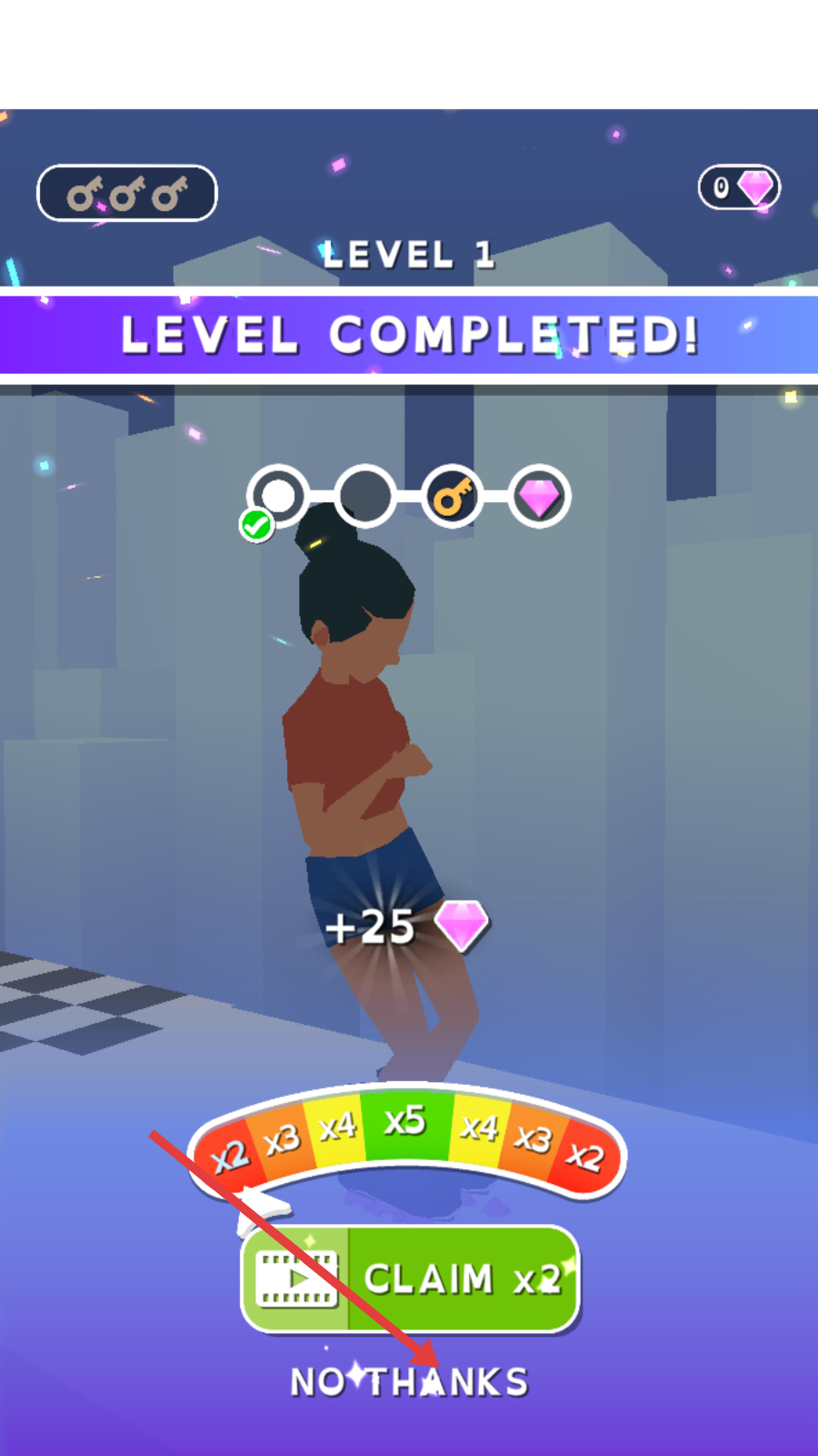 4、关卡完成后,若不想加倍领取奖励,点击【NOTHANKS】进行下一关。