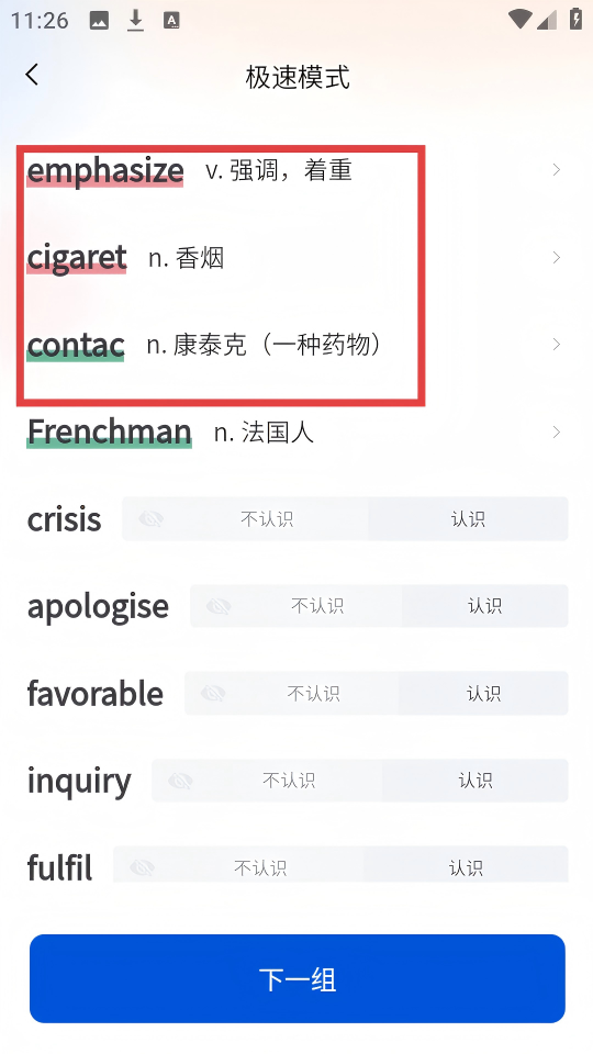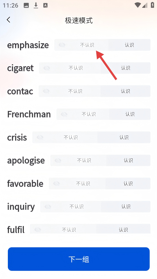 3、在【极速模式】单词页面,根据对单词的熟悉度,点击不认识或认识。