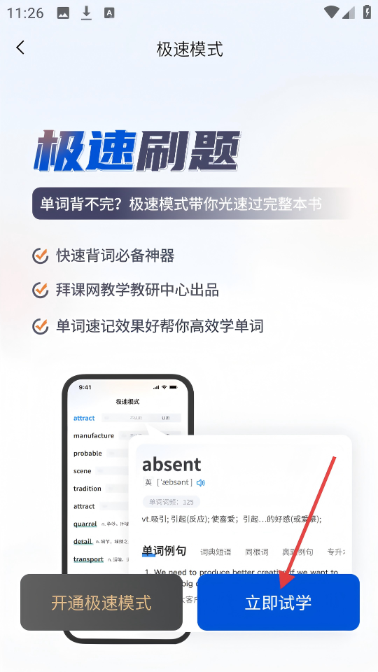 2、在极速模式介绍页,点击【立即试学】,体验极速刷题背单词。