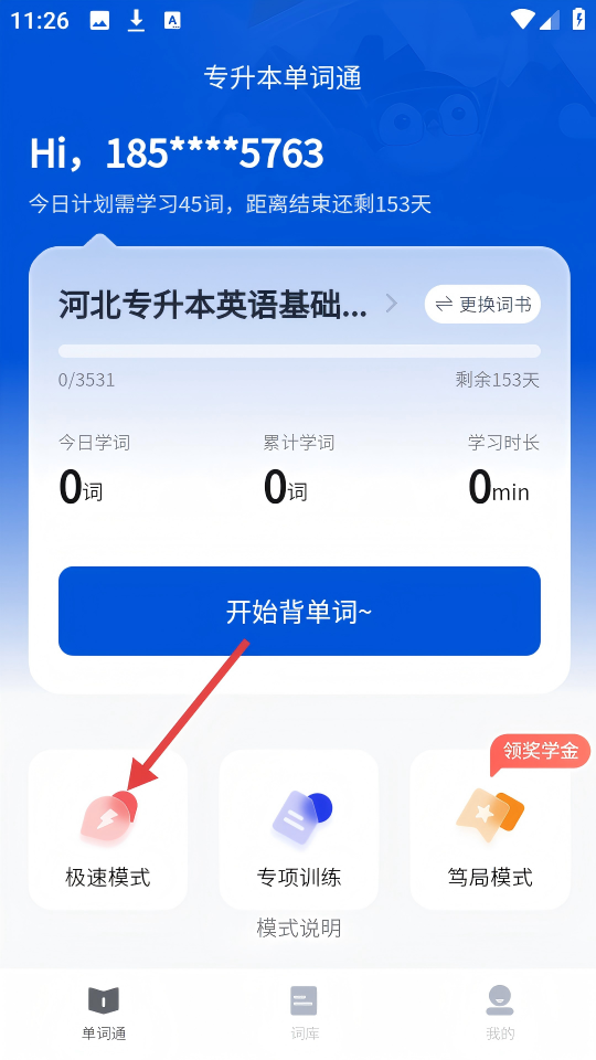 1、在【专升本单词通】首页,点击【极速模式】图标,进入极速模式页面。