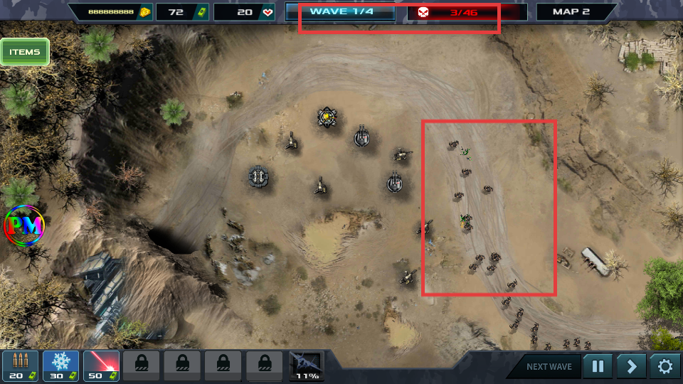 3、关注【WAVE】和敌人数量,合理布置防御,应对一波波敌人。