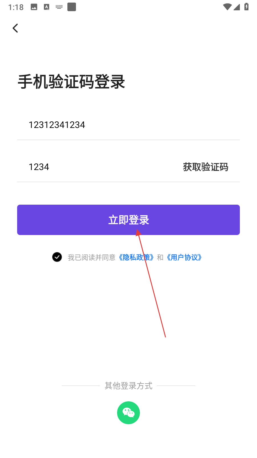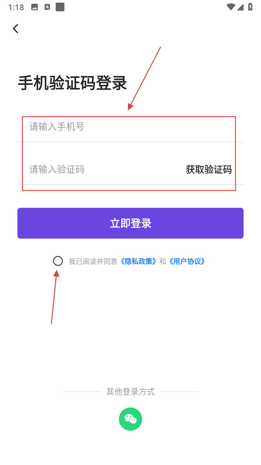 3、在手机验证码登录页面,先勾选【同意协议】,再【输入手机号和验证码】。