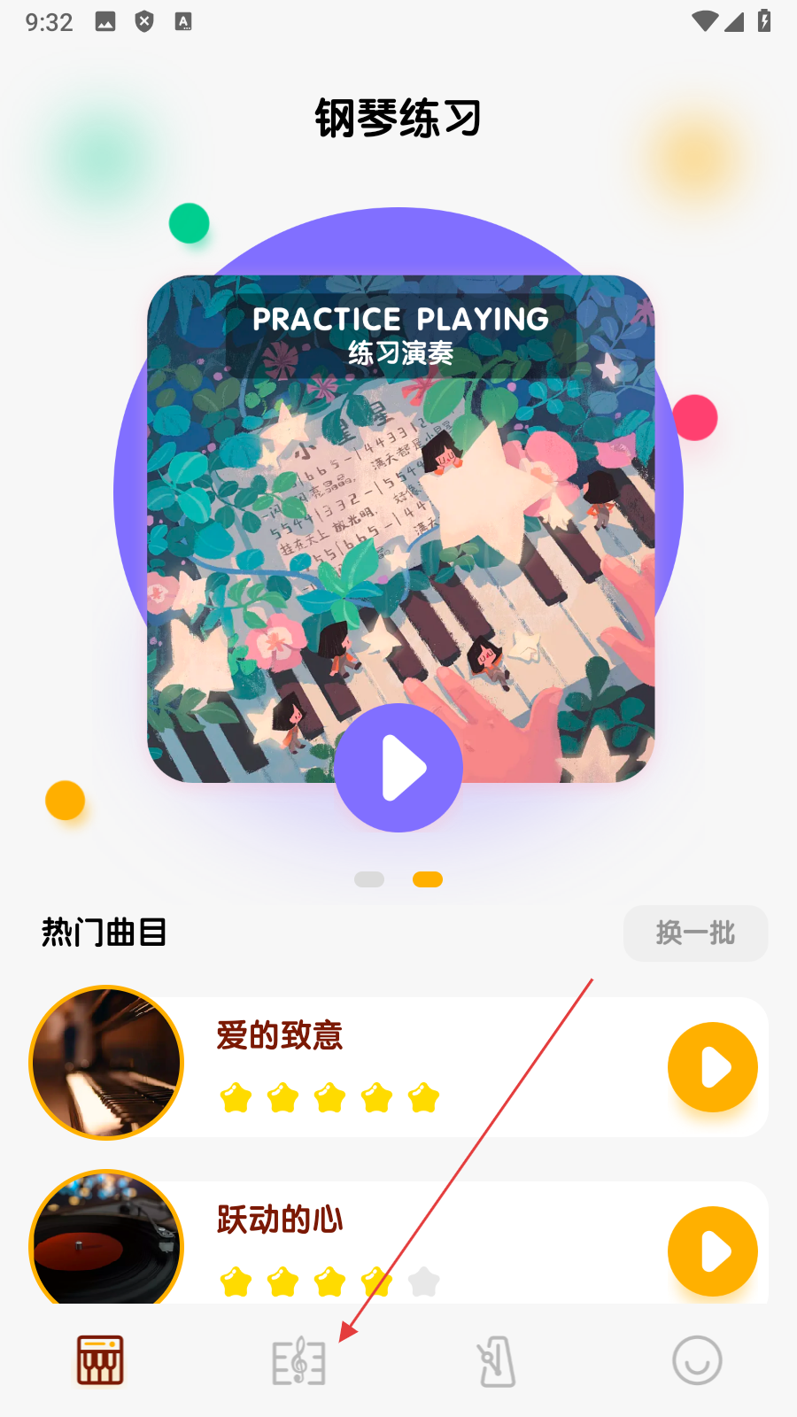 1、在钢琴练习页面,点击【底部的乐谱图标】,进入钢琴教程页面。