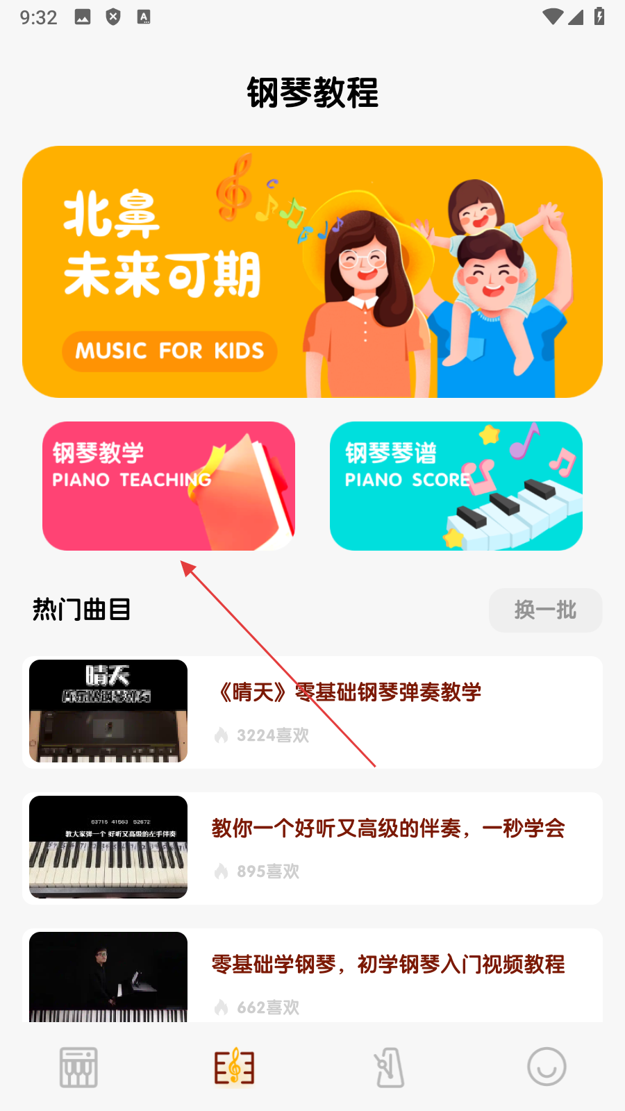 2、进入钢琴教程页面后,点击【钢琴教学】选项,进入钢琴教学内容列表。