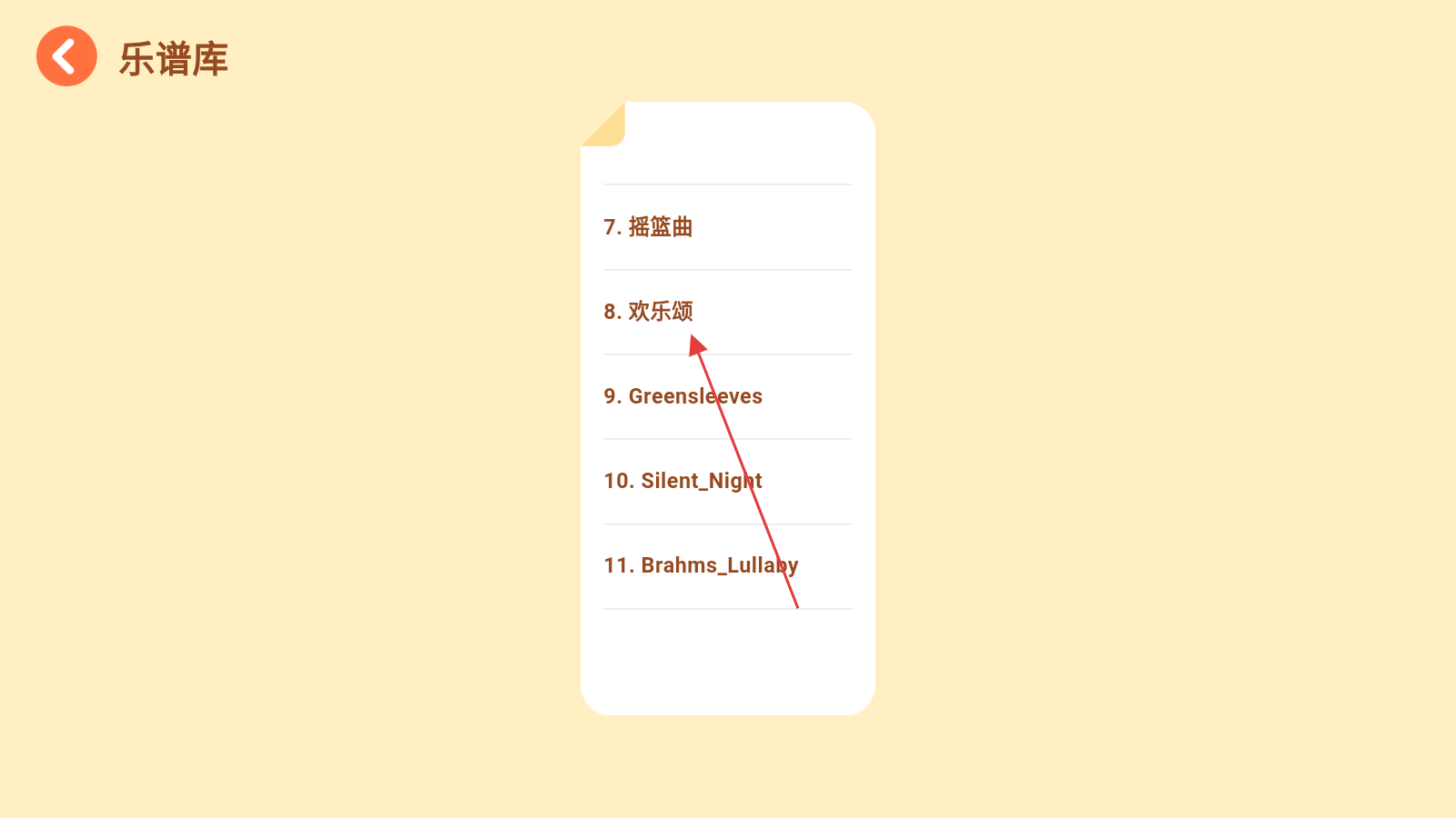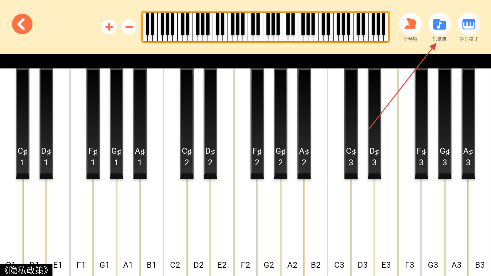 1、在钢琴界面,点击右上角【乐谱库】,进入乐谱选择页面。