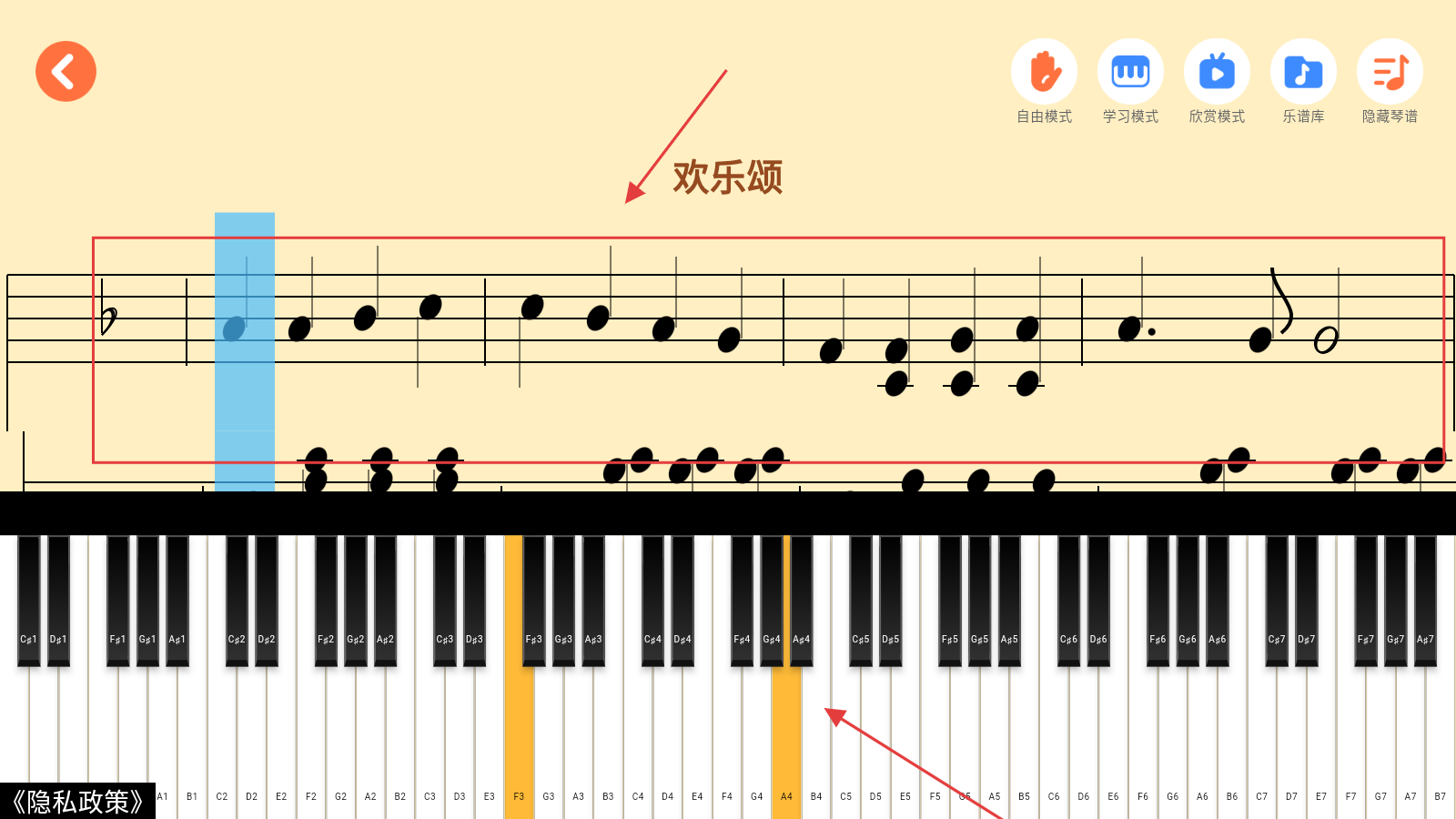 4、进入演奏页面后,即可跟着【显示的琴谱】,在下方虚拟钢琴上弹奏。