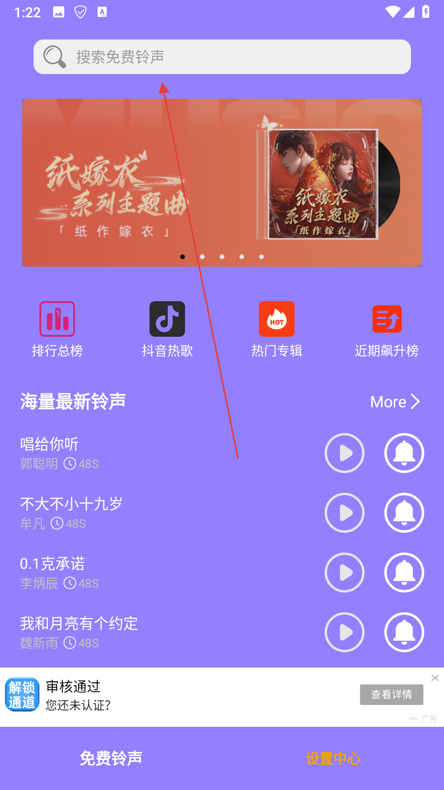 1、在首页,点击顶部【搜索免费铃声】搜索框,进入搜索页面。
