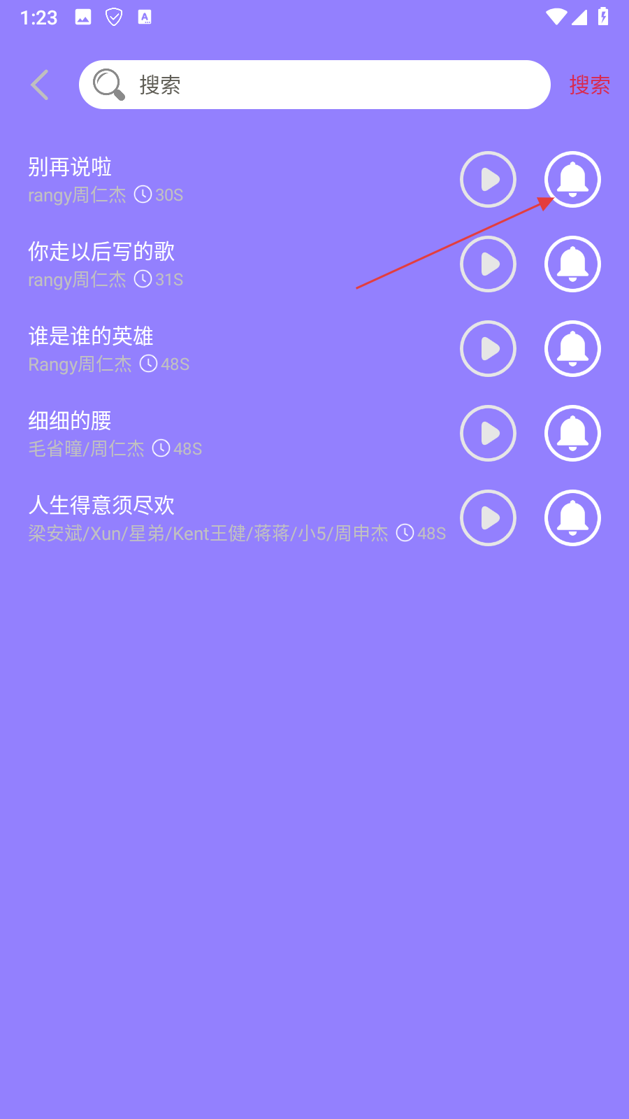 3、在搜索结果页面,找到目标铃声,点击【该铃声右侧的铃铛图标】。
