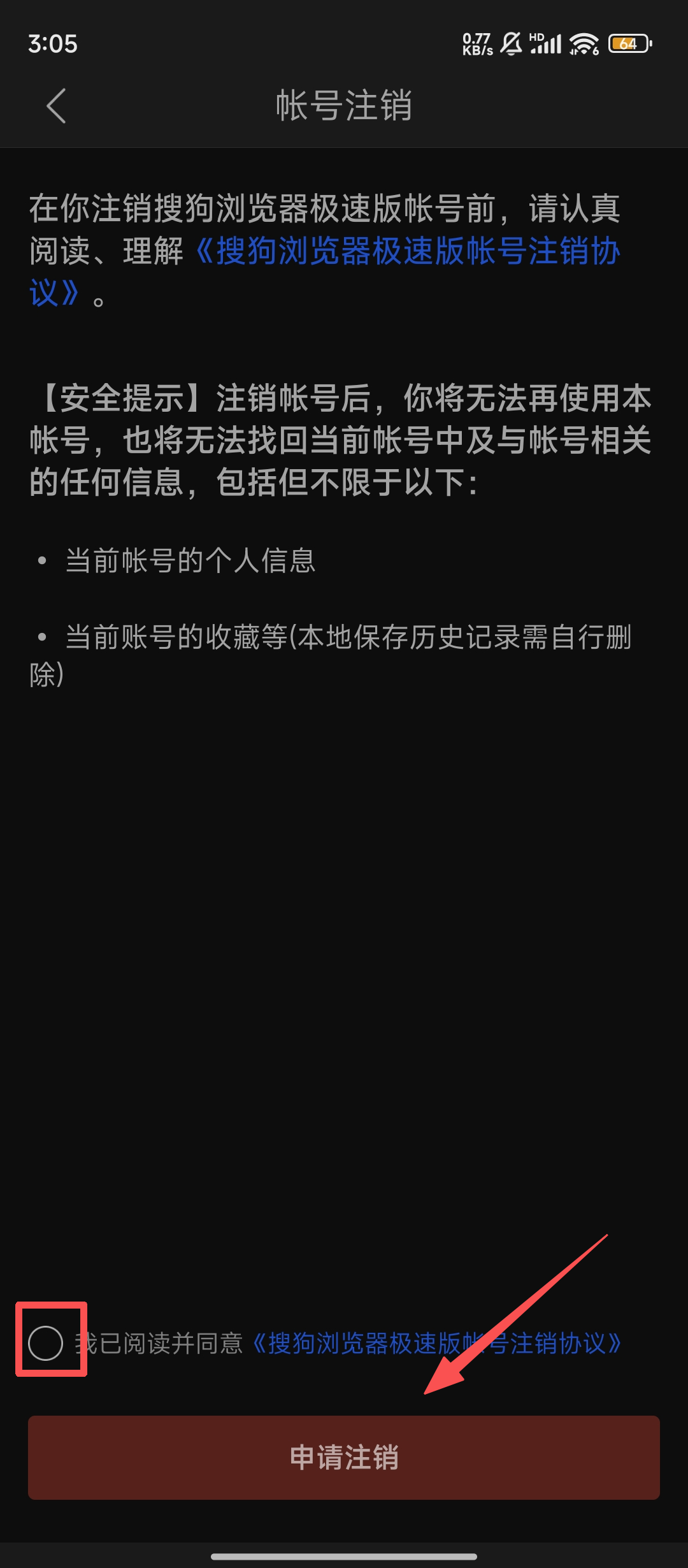 3、进入【帐号注销】页面后,仔细阅读【搜狗浏览器极速版帐号注销协议】,勾选条款,再点击【申请注销】按钮。