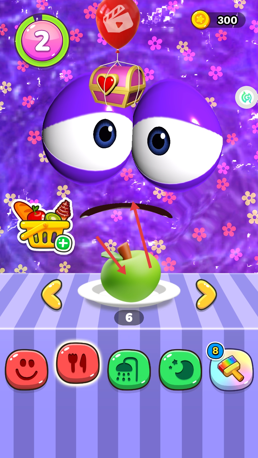 1、当餐具图案变红时,需要根据提示,点击苹果,喂给史莱姆嘴里。