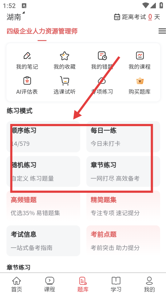 2、进入题库页面,选择练习模式,如“随机练习”。