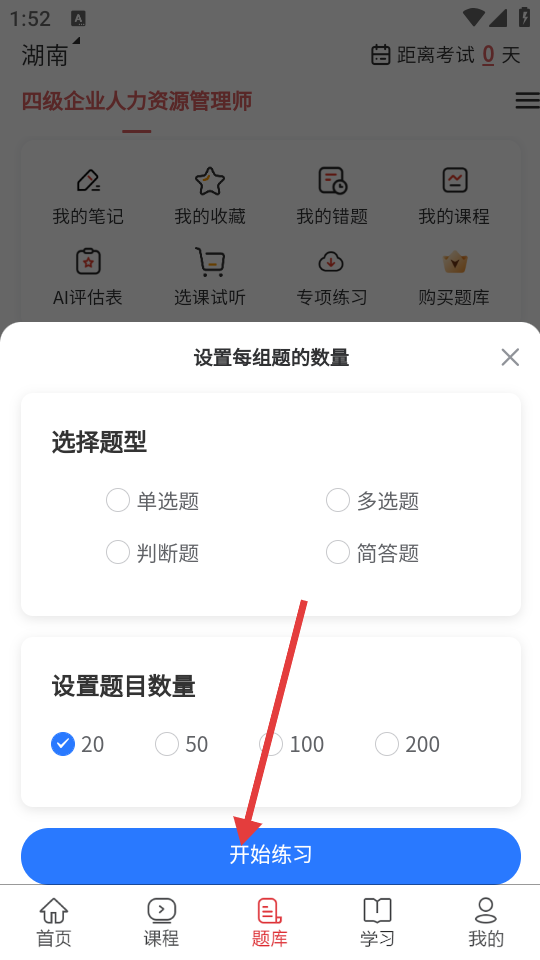 3、进入设置每组题的数量页面,选择题型和题目数量,点击【开始练习】。