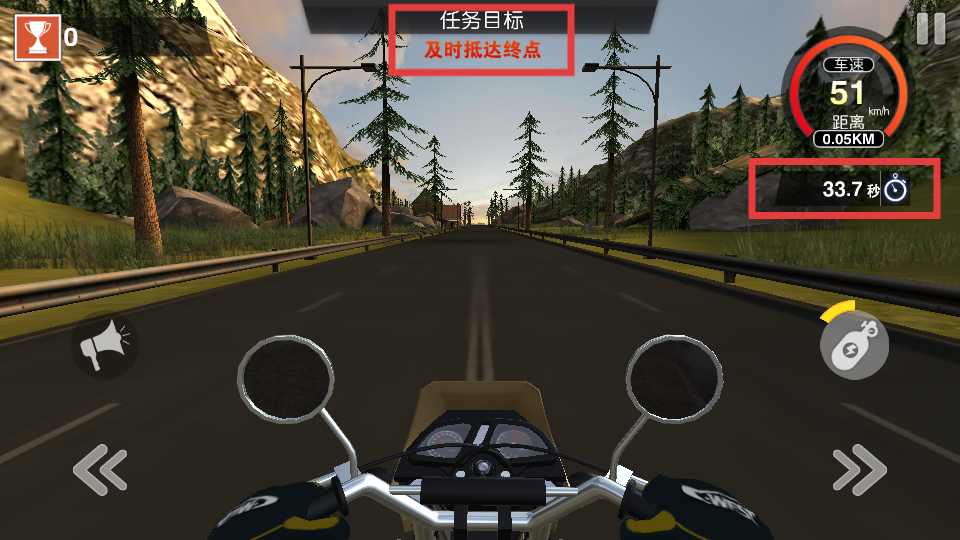 2、进入游戏,留意上方【任务目标-及时抵达终点】,并关注右侧红框内的【剩余时间】,合理规划行驶速度。