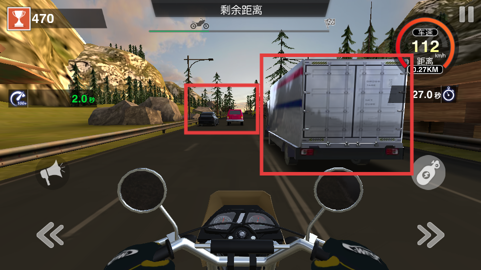3、行驶过程中,注意观察前方路况,避让红框内的【汽车】和【货车】等障碍物,确保行车安全。