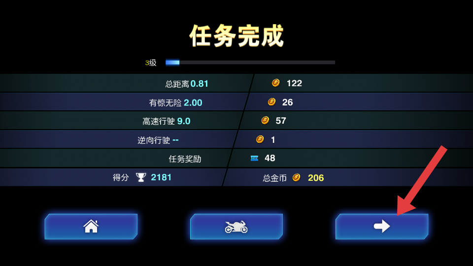 4、完成任务后,在【任务完成】界面查看奖励,点击右侧箭头按钮,继续后续关卡挑战。