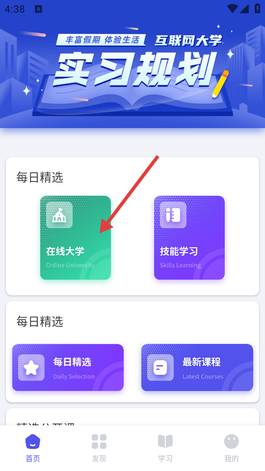 1、打开APP,在首页点击【在线大学】选项,进入在线大学页面。