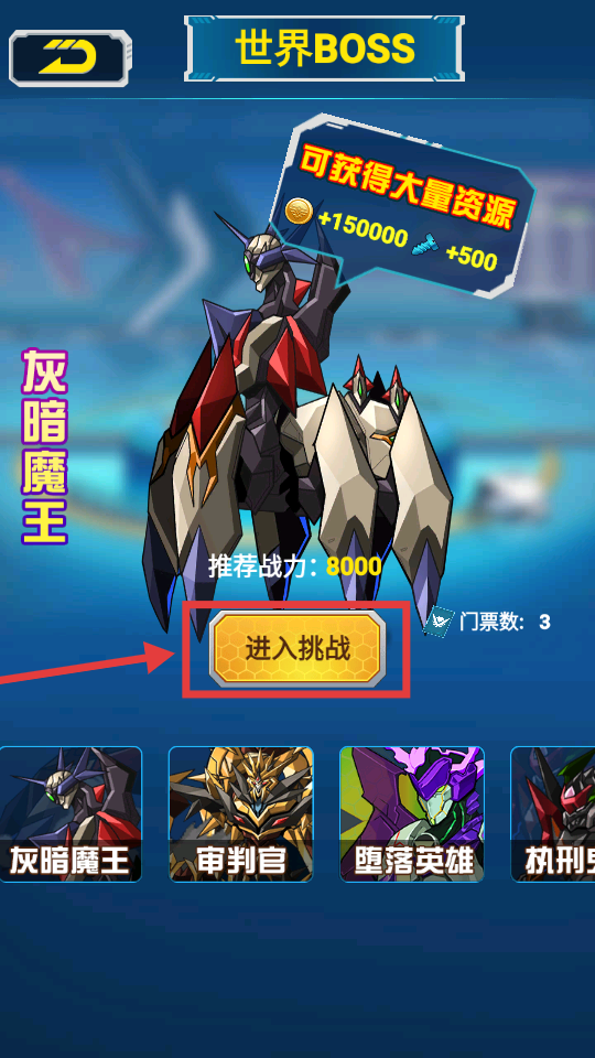 1、挑战【灰暗魔王】前确保战力达【8000】,点击【进入挑战】,消耗门票获大量资源。