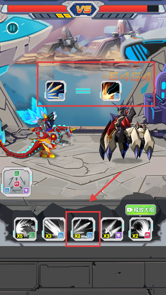 2、战斗时选【X2-远】等远程技能,消耗点数输出,上方显示伤害数值,需关注技能类型。
