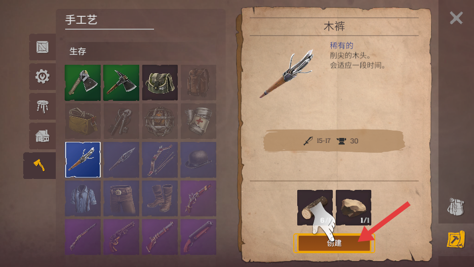4、进入手工艺界面,点击【创建】,制作木矛,完成【制作长矛】的任务。