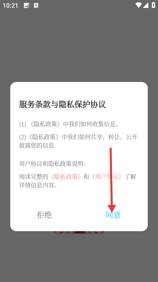 1、打开应用,阅读并同意服务条款与隐私保护协议。