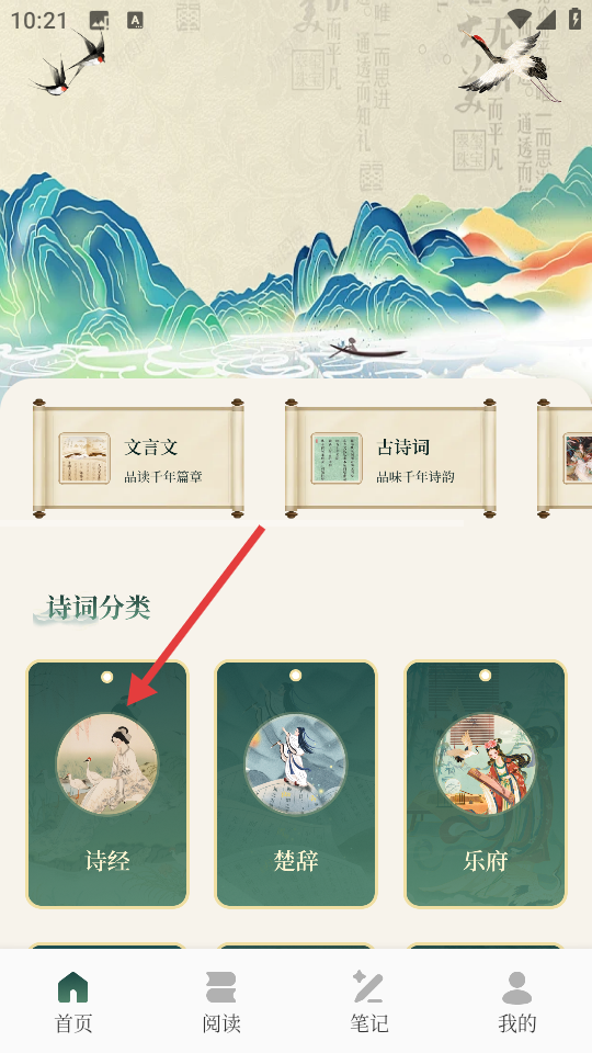 2、进入应用首页,在诗词分类中选择【诗经】,进入诗经篇目列表。