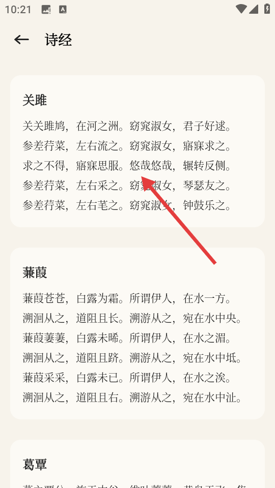 3、在诗经篇目列表中,选择想要查看的篇目,如《关雎》。