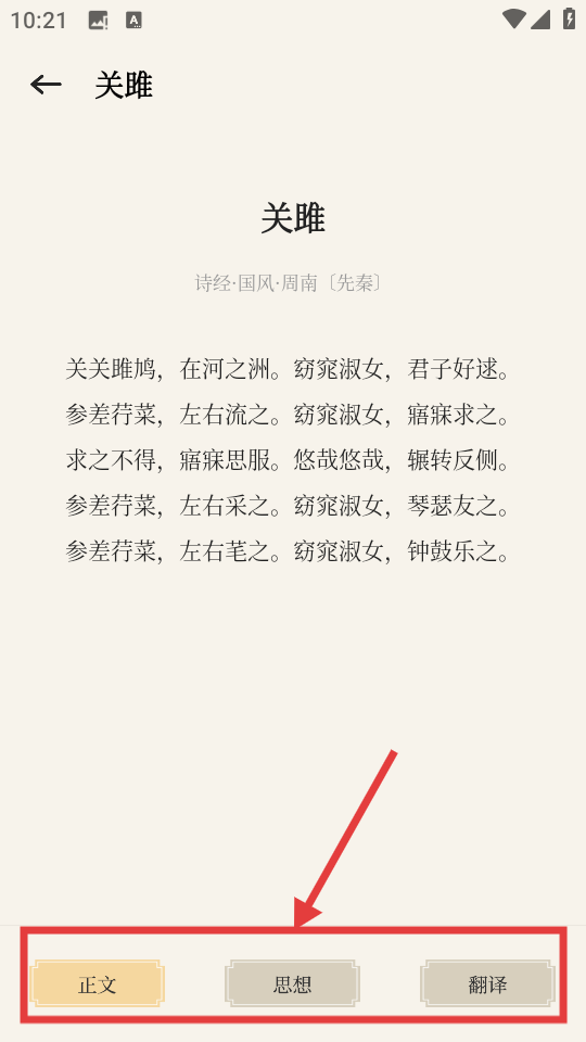 4、在篇目详情页,可查看正文,还能切换查看思想、翻译等内容,进行古典诗词学习。