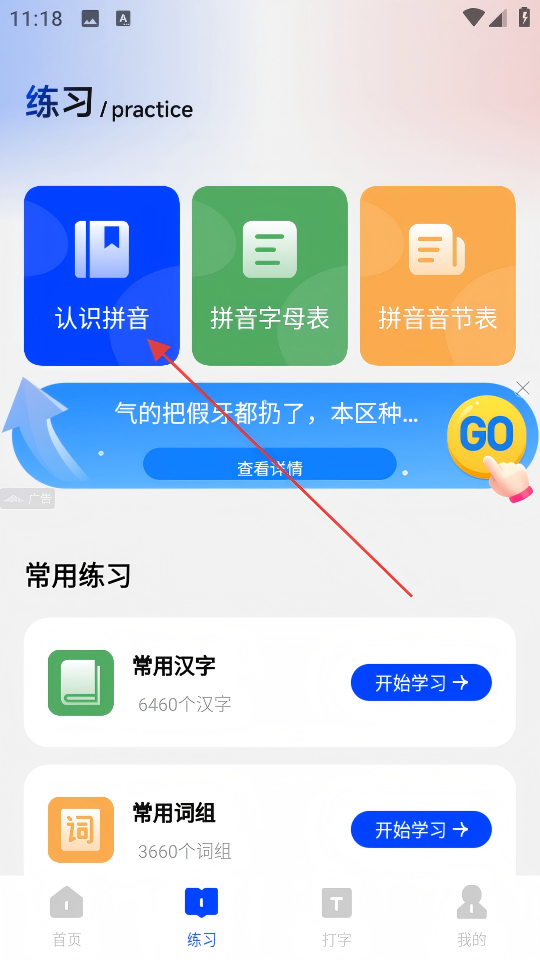 2、在【练习】页面,点击【认识拼音】。