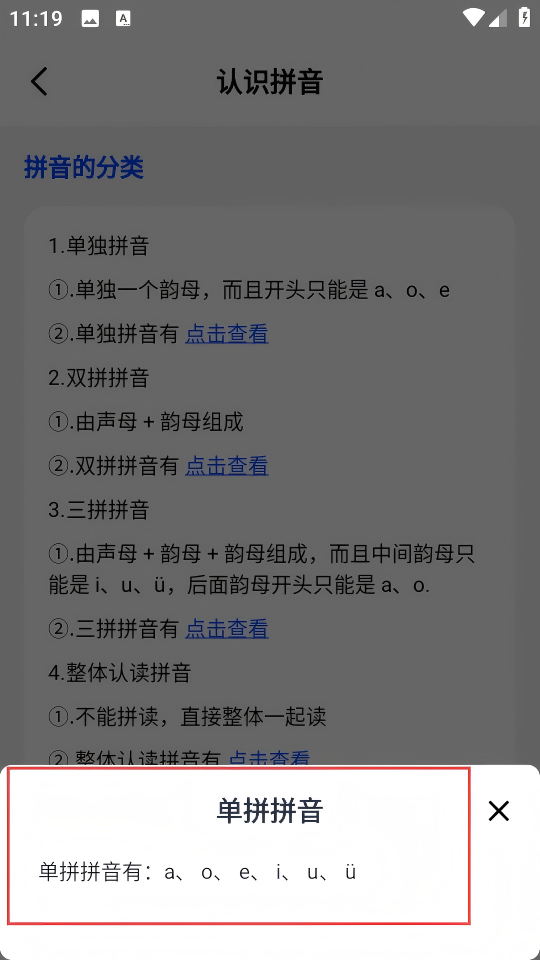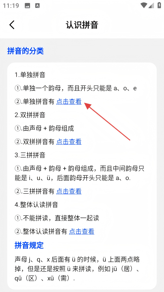 3、在【认识拼音】页面,点击单独拼音的【点击查看】。