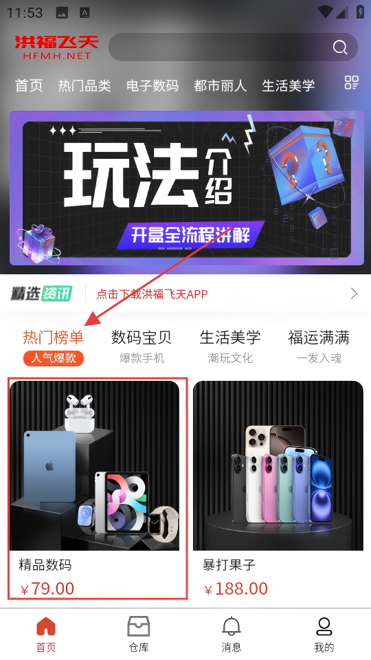1、打开洪福飞天APP,在首页热门榜单中找到“精品数码”商品。