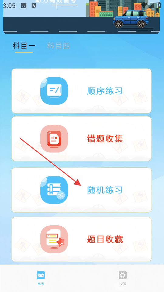 1、打开APP,在“驾考”页面,点击【随机练习】。