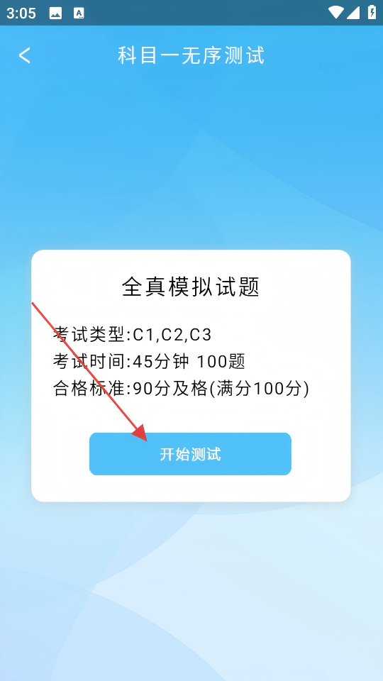 2、进入“科目一无序测试”页面,点击【开始测试】,进行全真模拟试题测试。