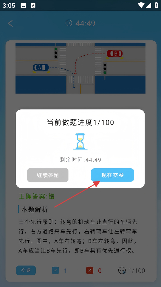 4、交卷后,可查看题目解析,了解答题情况,也可选择“继续答题”或“现在交卷”。
