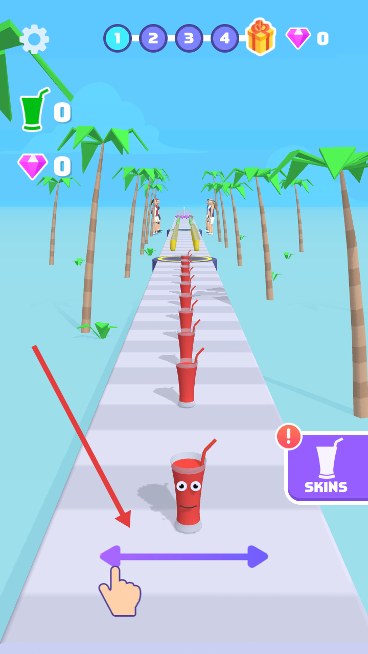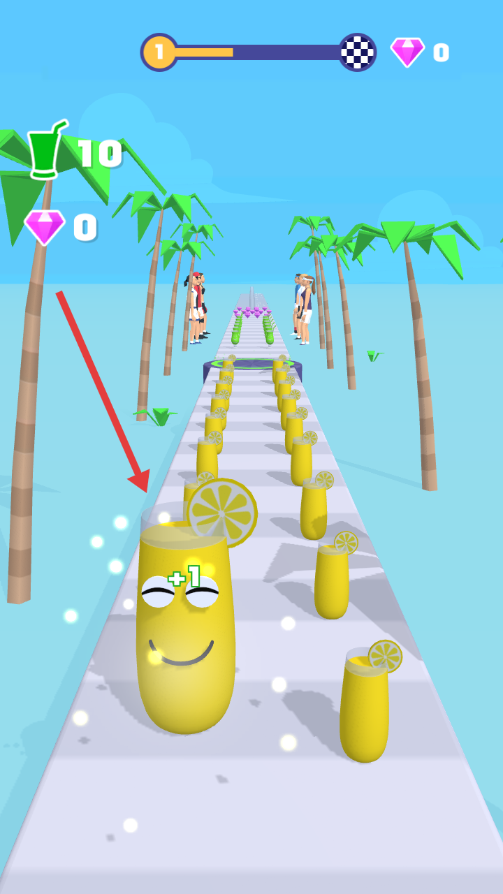 1、左右滑动屏幕控制饮料角色在路径上移动,收集同类型的饮料,壮大自身规模。