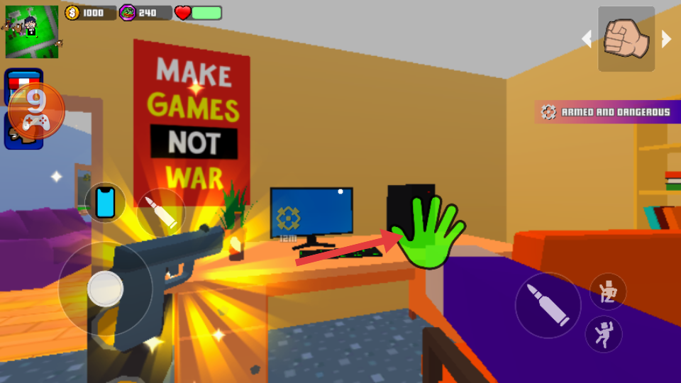 4、点击手掌图案拾取桌上的枪械,装备武器,增强战力,推进游戏进程。