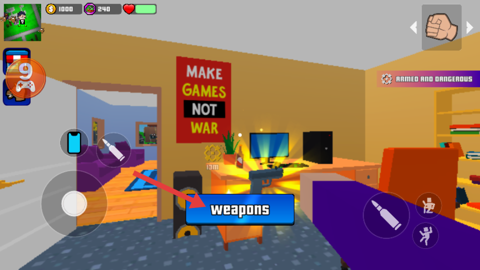 3、点击【weapons】按钮,获取武器,提升战斗能力,为战斗做好准备。