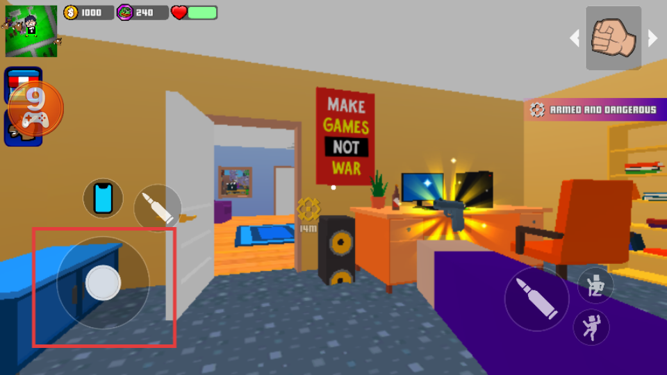 2、通过左侧虚拟摇杆控制角色移动,在房间内探索,寻找资源和道具。