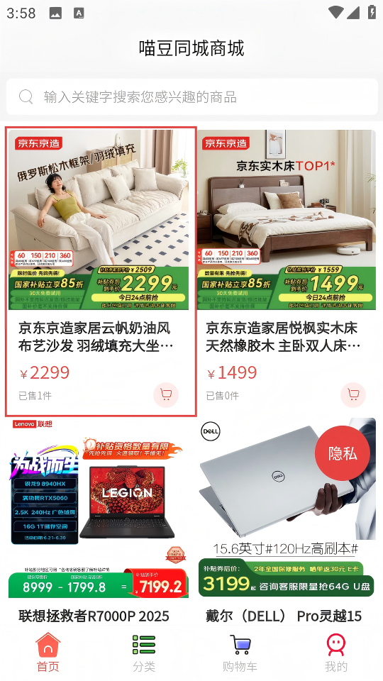 喵豆同城是一款专注同城购物服务、汇聚海量优质商品资源的平台,面向有多样化购物需求的用户,涵盖手机、电脑、家居等多品类商品,支持按销量、价格等综合条件筛选商品,可一键加购至购物车并统一结算,商品价格经济实惠且品质有保障,能让用户轻松享受沉浸式、高性价比的同城购物乐趣,无需复杂操作即可完成心仪商品选购。