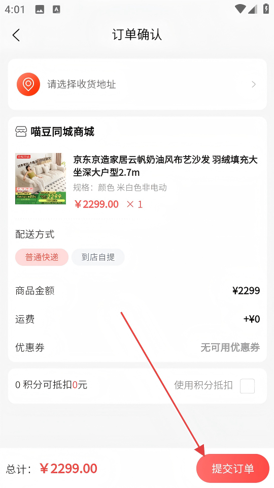 4、进入订单确认页面,选择收货地址、配送方式,确认订单无误后点击【提交订单】完成购买。