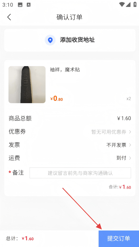 4、进入确认订单页面,添加收货地址,点击【提交订单】,完成购买。