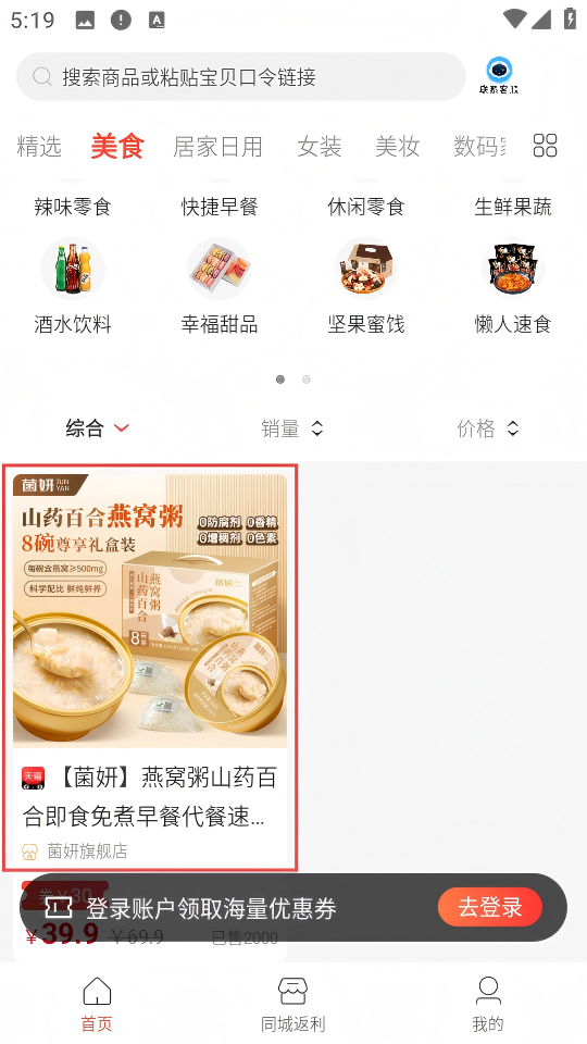 1、打开APP,进入美食分类页面,选择“菌妍山药百合燕窝粥8碗尊享礼盒装”商品。