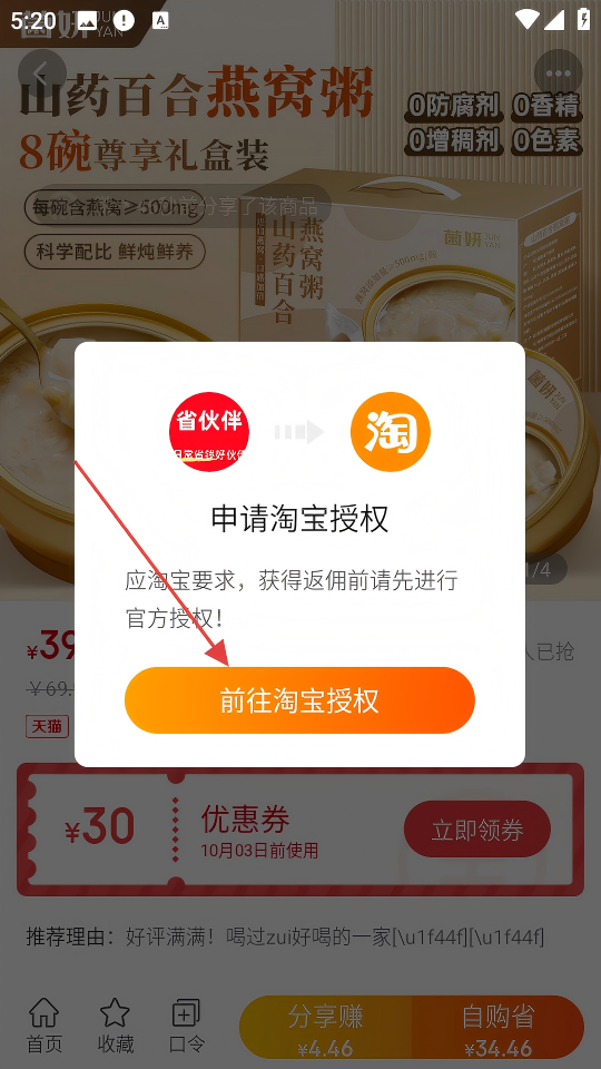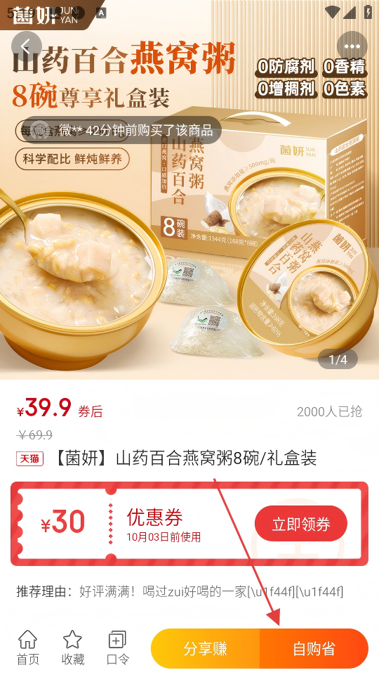 2、进入该商品详情页,领取30元优惠券,点击【自购省】。