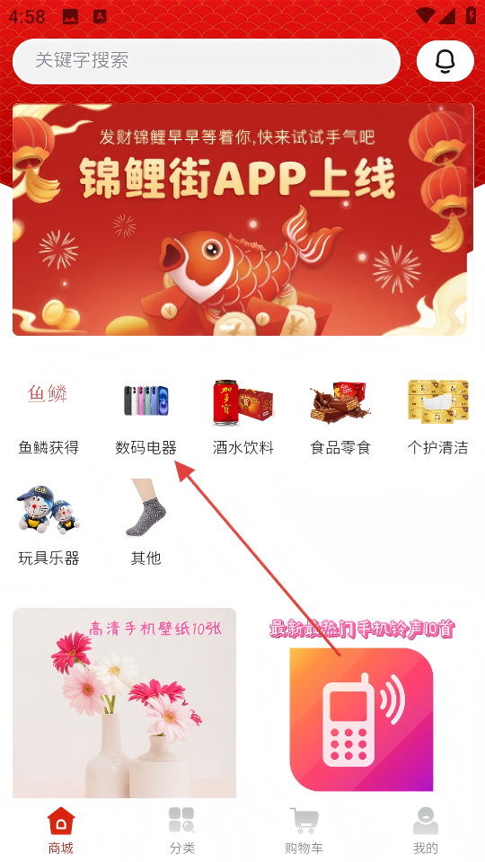 1、进入【商城】板块,点击“数码电器”分类。