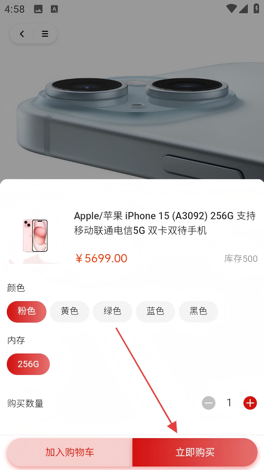 4、选择颜色、内存、购买数量后,再次点击“立即购买”,完成购买。